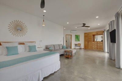 This premium suite offers even more space to stretch out and unwind. With a cozy king bed, lounge area, fridge, an oversized private patio, and a larger dipping pool, this suite is a step up in both size and luxury. Enjoy sweeping ocean views, air conditioning, and an ensuite bathroom. The perfect option for friends or duos wanting extra room and comfort throughout the retreat experience. This room is for two people. Please only book this option if you are signing up with a friend or partner!