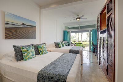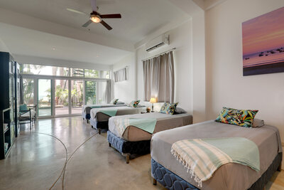 Our most budget-friendly option, this inviting room features four comfy twin beds and a shared ensuite bathroom. Ideal for solo travelers or friends looking to connect, this shared space includes a private patio with seating, AC, and ocean views. This room is for four people, is female only & great for someone who is looking for community connection while on retreat.